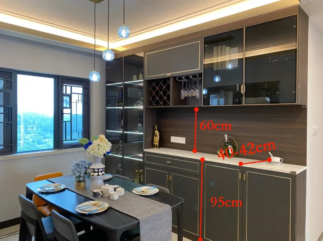 ① 碗橱深度→40~42 cm,可放置一些小家电等,而且做得太深不美观,显得碗橱太大。