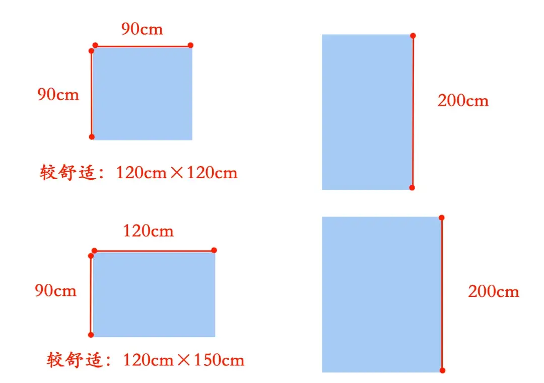 个人的进餐空间宽度60 cm,深度80 cm,占桌的尺寸大约是40 cm×60 cm。