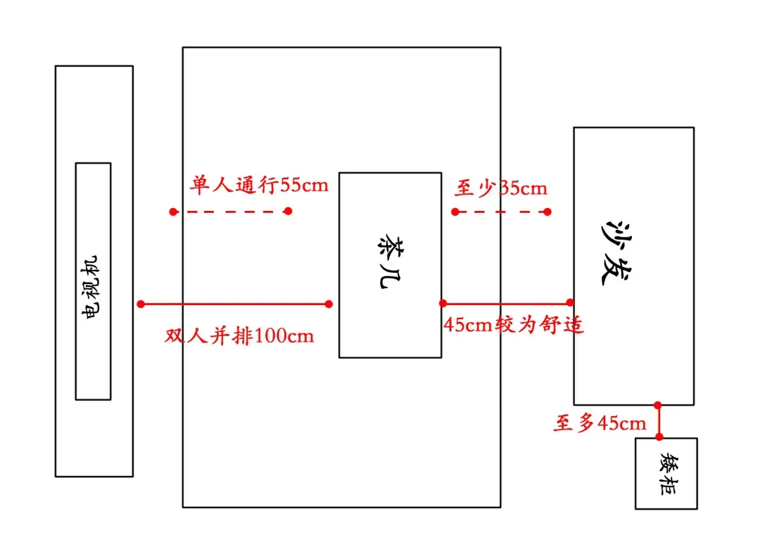 茶几上有电视有人通过,一个需要55 cm左右,两个同时需要100 cm左右。