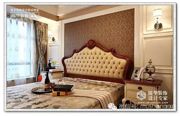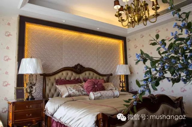 重视舒适与放松的卧室,墙面利用温馨的米色壁纸和深色木框的搭配突出了温润的舒眠氛围。