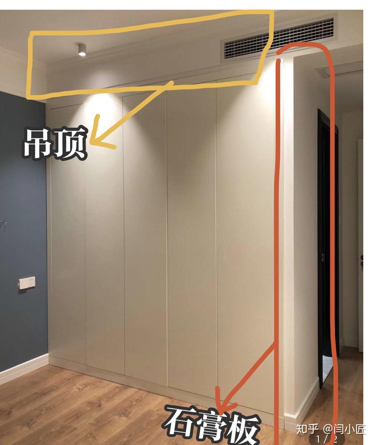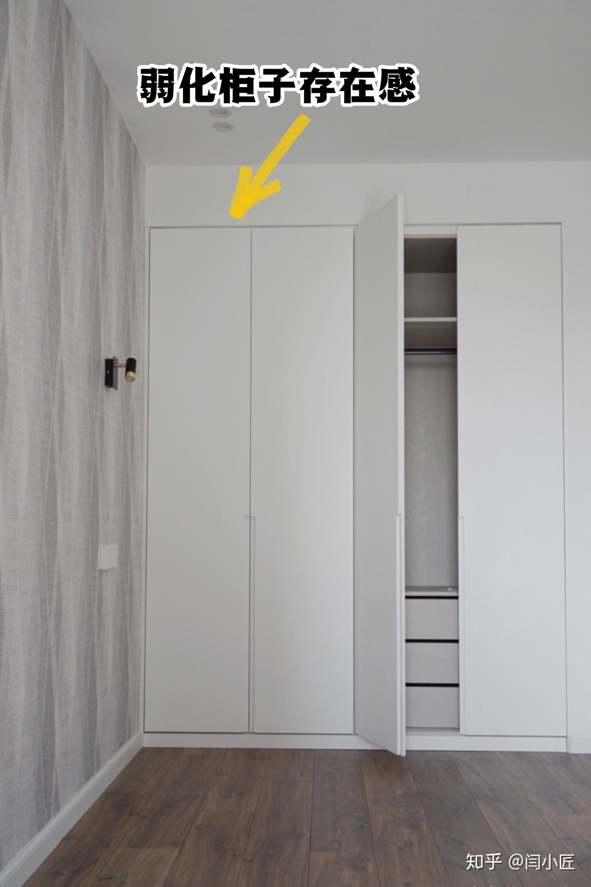 衣柜顶部预留10-15CM垂直吊顶,而侧面用轻钢龙骨石膏板来做一面墙,立马就能营造出“嵌入式衣柜”的感觉。