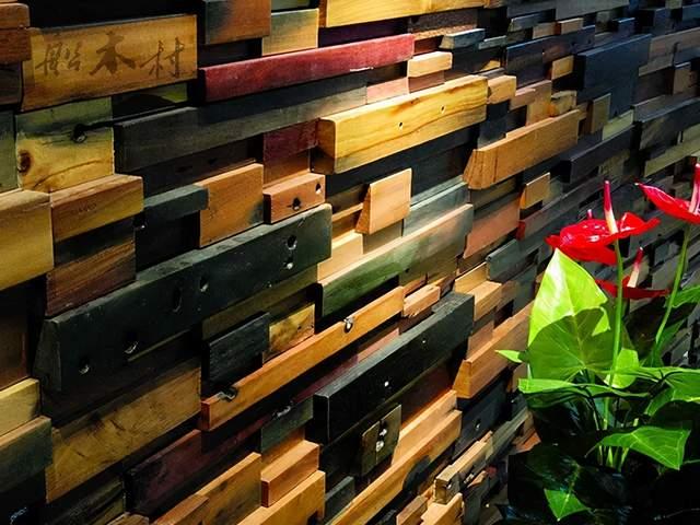 注:从左到右为船木椅子、老船木电视柜、船木马赛克、船木房梁、船木办公桌、船木窗户、船木博古架。