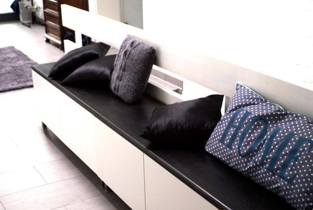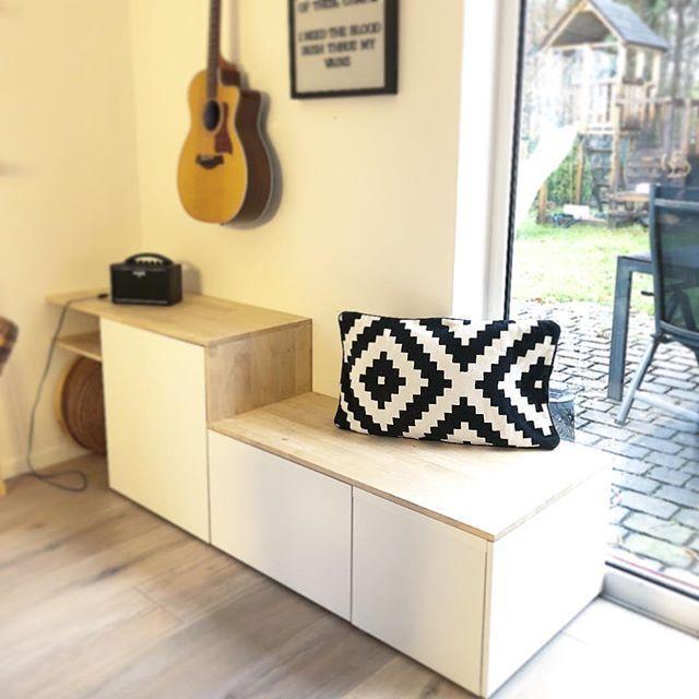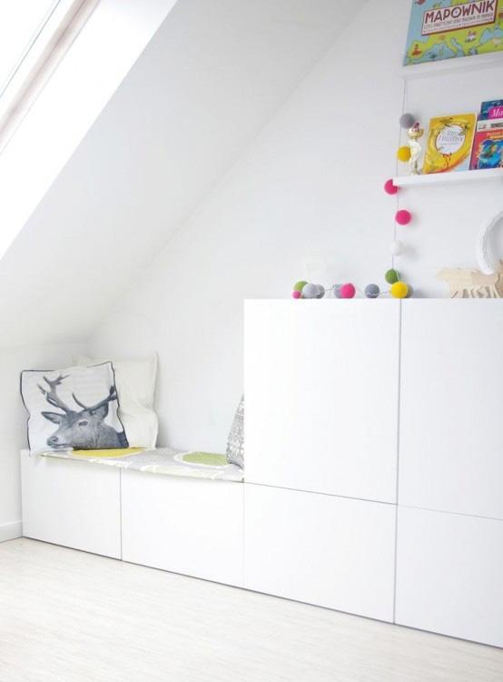 用储物柜组合成一个长椅,放上坐垫和面板,或坐或玩都可以。