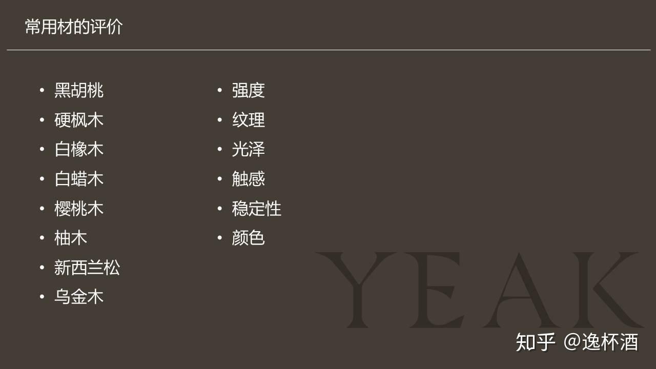 然后我们进入到评价指标的环节,我们会从强度、纹理、光泽、触感、稳定性和颜色六个方面来综合评价一个家具用材。