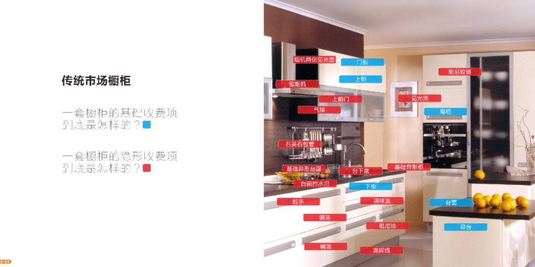 橱柜:见光面(一般会送烟机两侧小的,柜体两侧大的不送),石英石升级(杂牌石英石只要200一米的拿货成本),切角,杂牌抽屉升级阻尼,气撑升级品牌,锅篮碗篮升级,调味篮升级.每一项都要再加几百上千,多如牛毛的附加和升级项目让一套橱柜价格比最初的报价翻了几番。