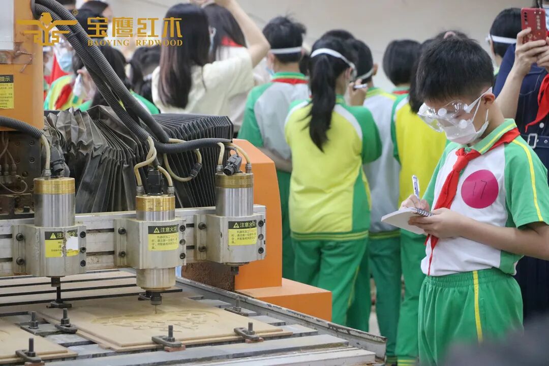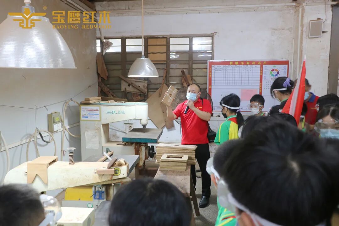 在家宝红木工作人员的引领下,孩子们呼和雀跃地走进工厂,了解红木家具生产制作流程。