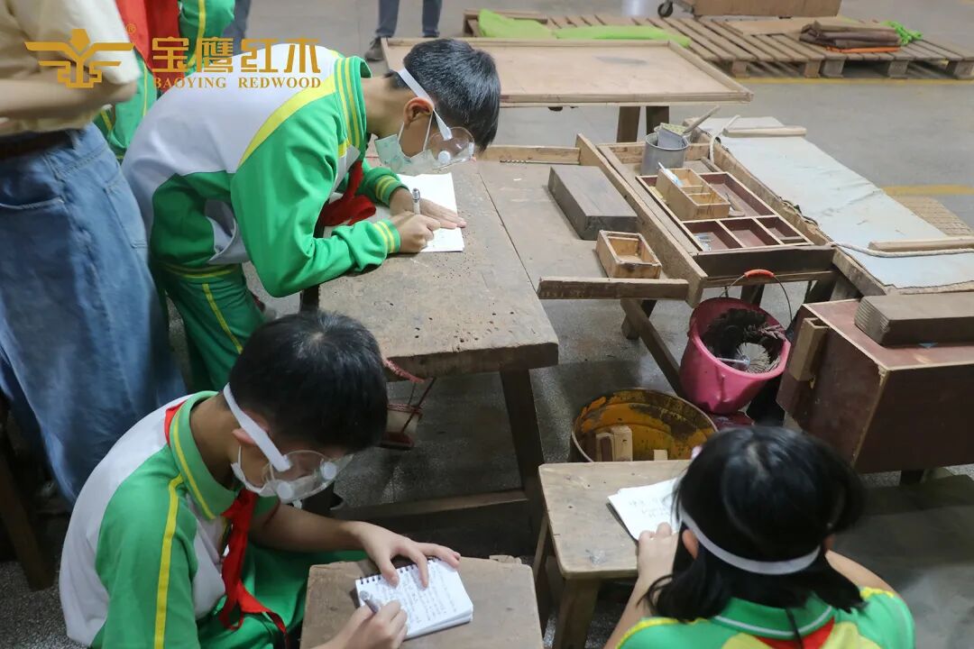孩子们如此近距离地了解红木家具制作流程,全程全神贯注,认真记笔记,让他们对传统工艺多了些敬意,对其中蕴含的人文情怀多了份理解。