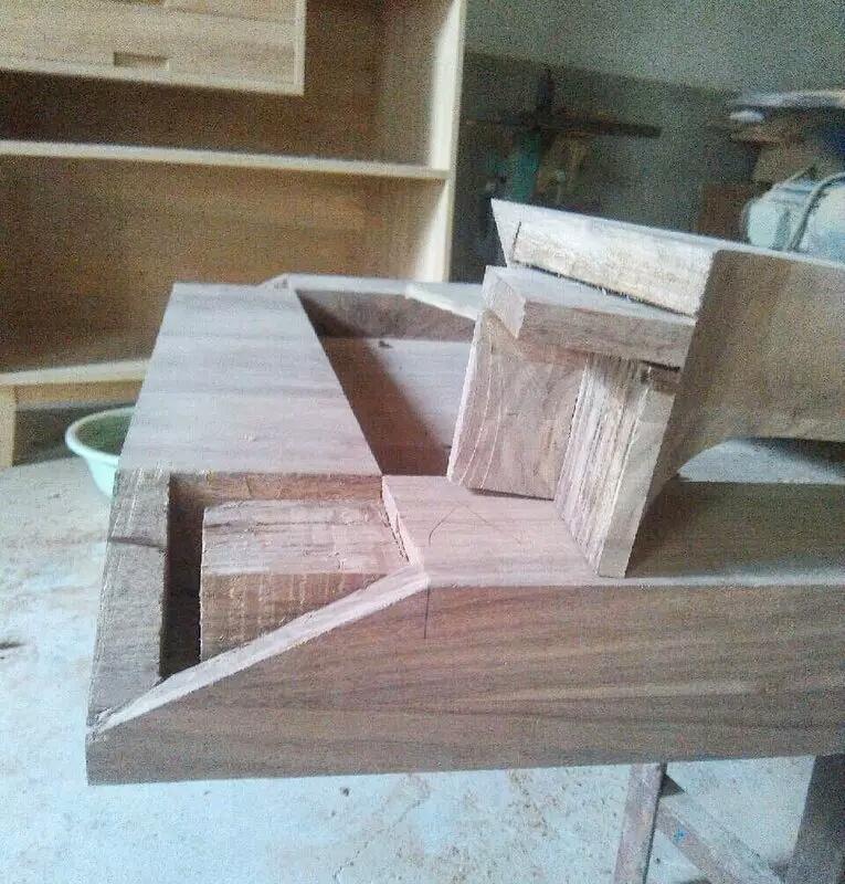 所以,这个桌子用到了一个我琢磨了很久的一个直角抱肩榫,嗯这个听起来很二的名字也是我起的,也是在我们家老爷子的指导之下设计制作的